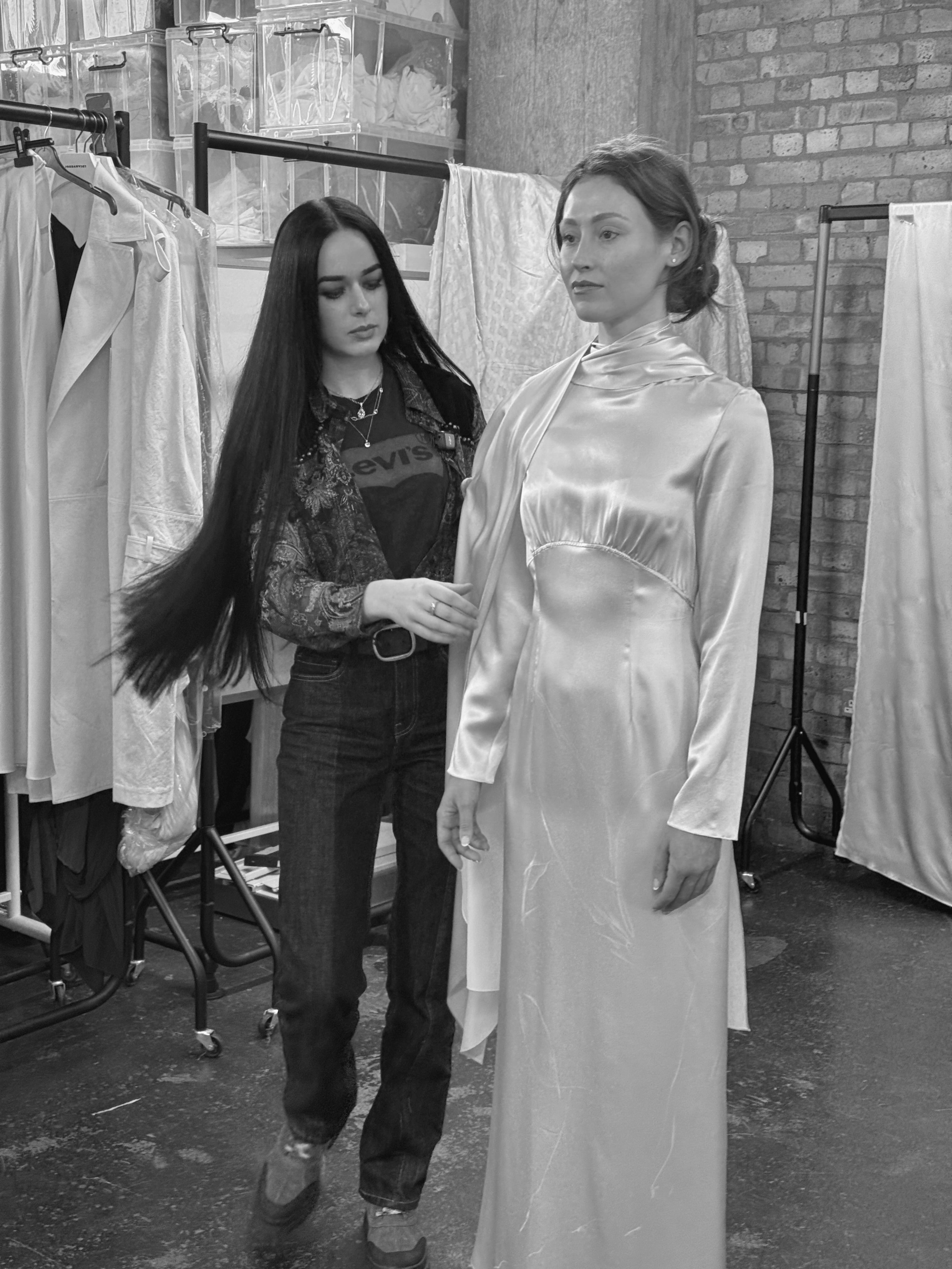 The craftsmanship behind each gown takes place in a London atelier, where the entire process, from pattern cutting to sampling to final production, is carried out by skilled professionals. Pattern cutters and seamstresses work through several rounds of sampling, fittings and alterations before the final version is approved. This human craftsmanship is integral to the garment; nothing is rushed, and nothing is outsourced to cut corners.