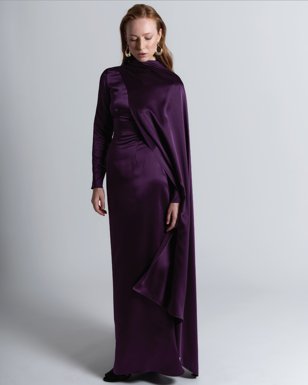 The True Kimesca Modest Dress is a long-sleeve, full-length silk maxi dress designed with a European design approach. Crafted from 100% mulberry silk, it features a delicate under-bust seam with micro gathers, relaxed long sleeves, a fluid column silhouette, and a maxi drape front layer. A concealed back zip with hook-and-eye fastening allows for ease of wear and a clean finish.