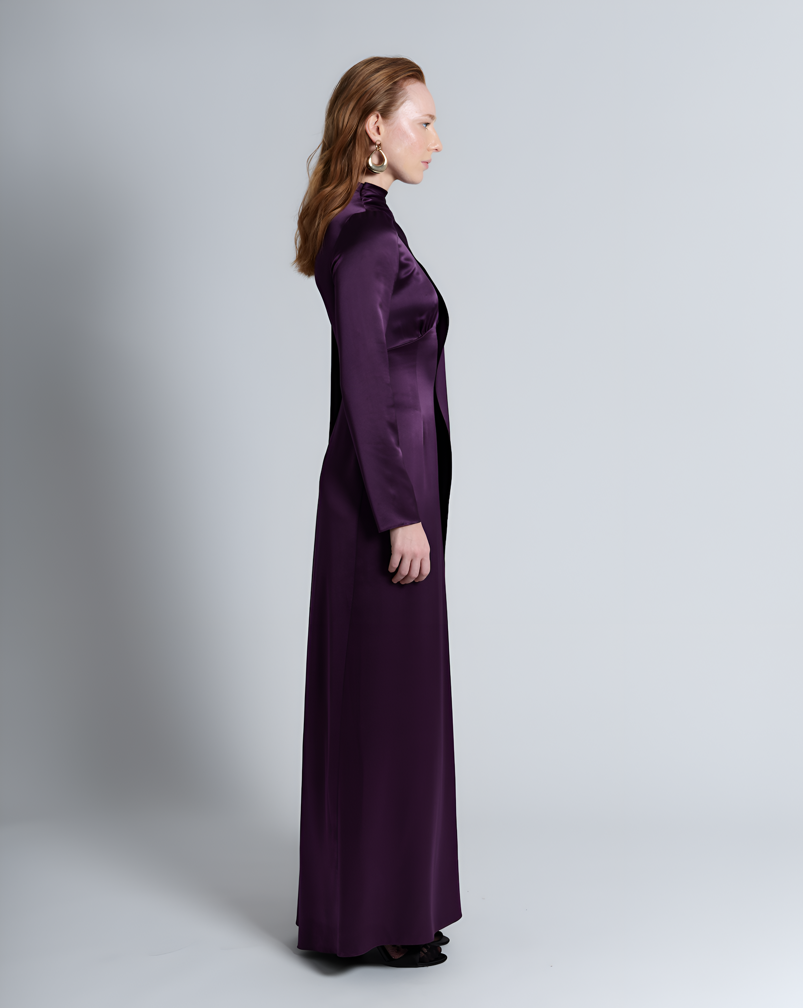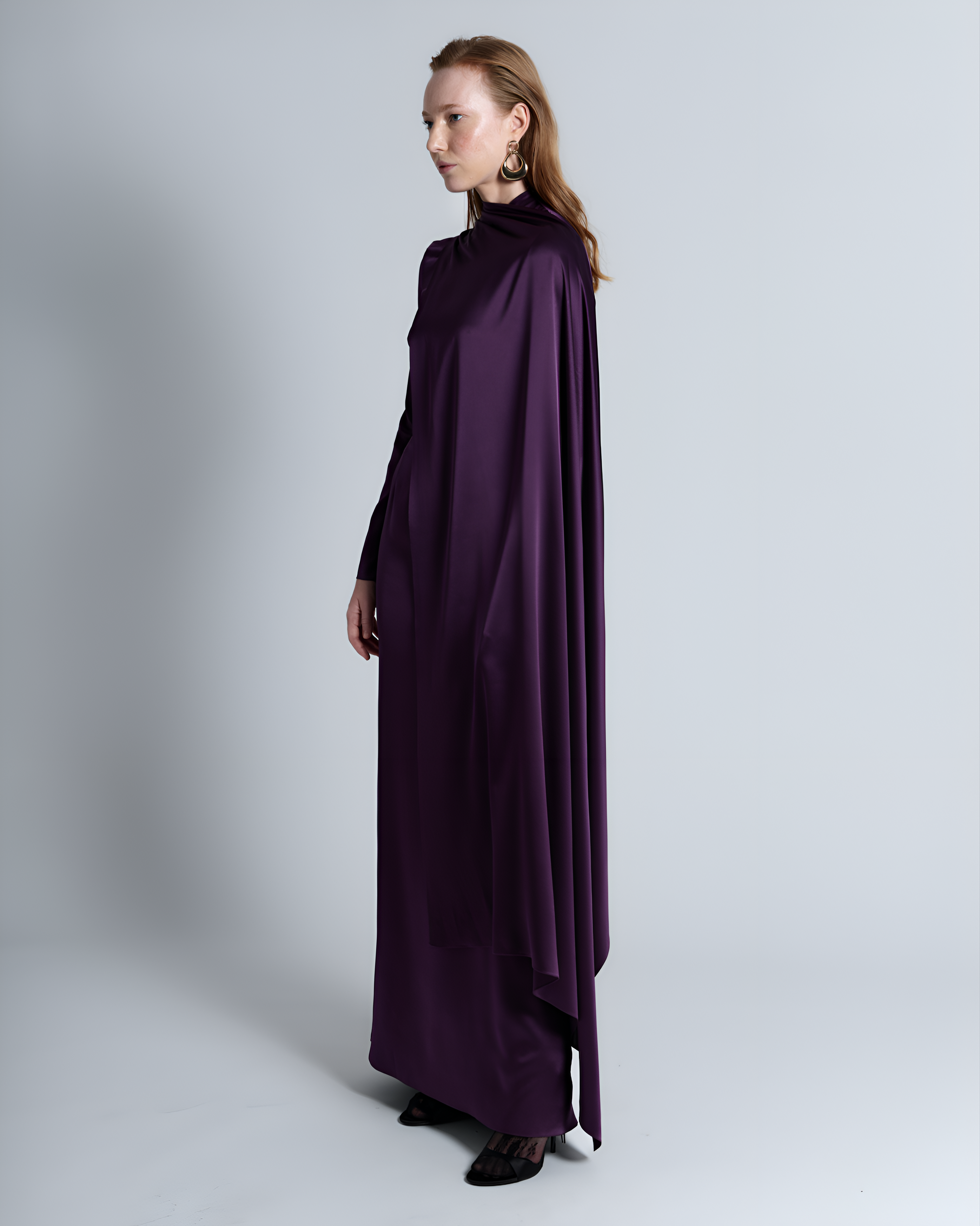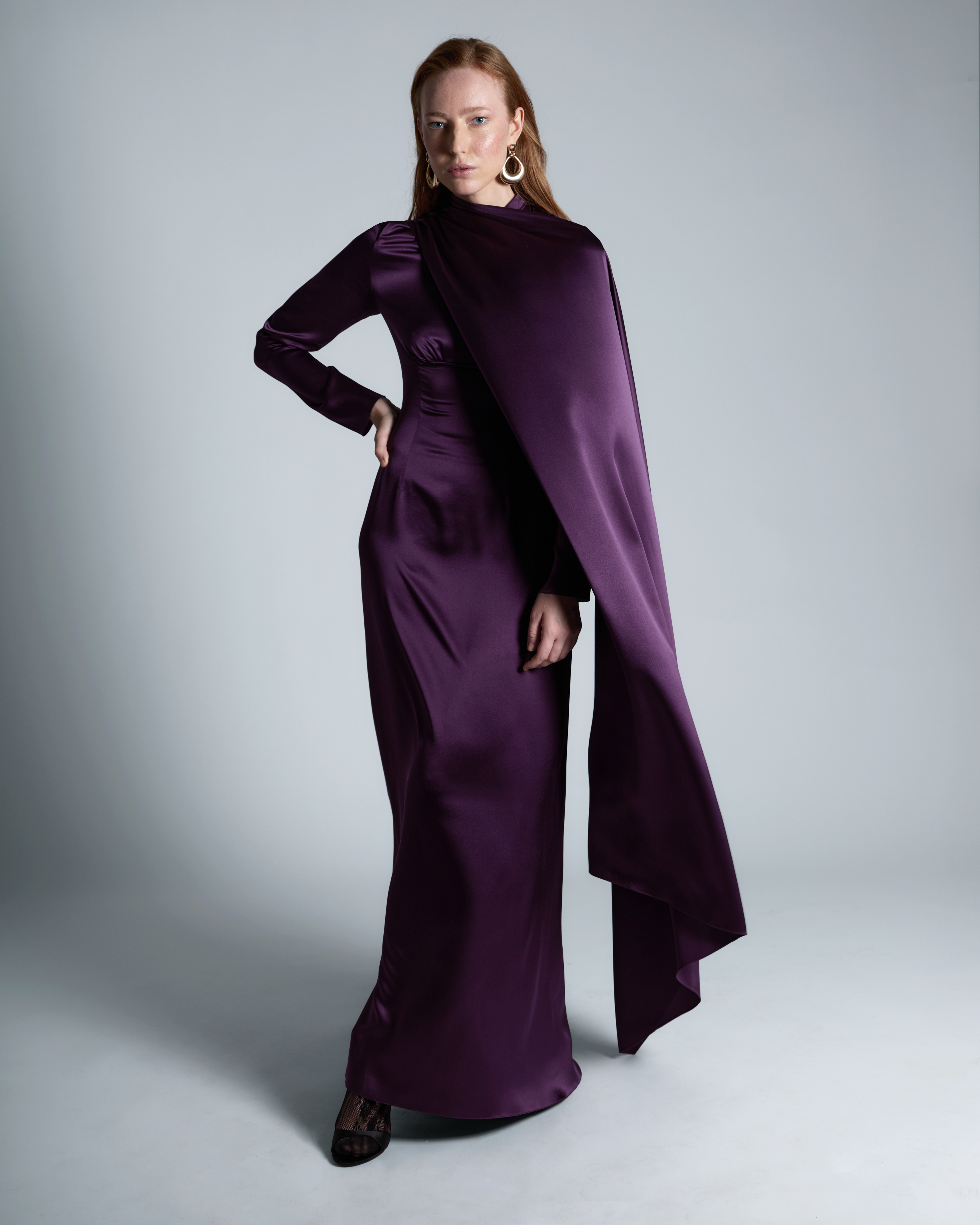 The True Kimesca dress is a 100% mulberry silk modest maxi dress, showcasing the brands signature silhouette. With a delicate under bust seam and micro gathers, relaxed long sleeves, slinky column fit, and a maxi drape front layer. A concealed zipper with hook and eye is at the back for easy entering and fastening.
